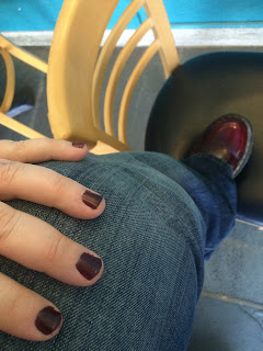 I wore my favorite jeans, a light pink button down shirt, black suspenders, my maroon boots, maroon nail polish, bright red matte lipstick, and a striped hat. A note on the nail polish: the nail polish was a gift from my friend "Alice." I really like it so I was super happy to learn that ALL of Julep's nail polish is cruelty free and vegan. Woohoo! I see more of this brand of nail polish in my future...