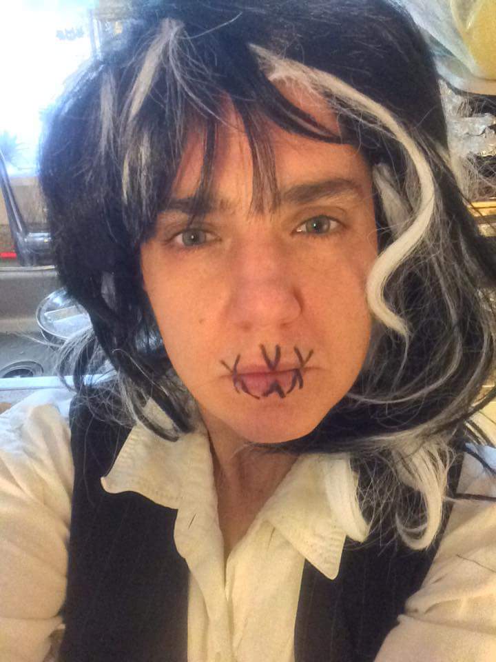 Joy was Mary, the middle sister. She's the funny one who loves eating but hates candy, has a weird horn-shaped hairdo, rides on a vacuum cleaner in one memorable scene, and can smell kids from miles away. Joy is probably the biggest goofball of the three of us so this character totally fit her best. She got the dress and cloak from the thrift store. Her hair was actually two wigs and she doctored up the second one so it would stick up like the weird hair of Mary Sanderson.